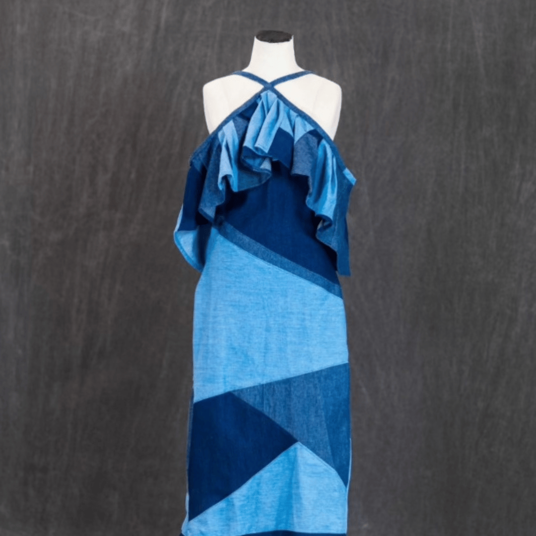 Summer Collection 2023 Designed: by Karina Urbina Created with three different denim, slim fitted dress, with an off the shoulder ruffle look.